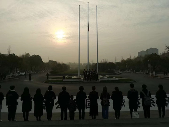 清晨7点,迎着朝阳,该院师生代表参加了学校国家公祭日升旗仪式。