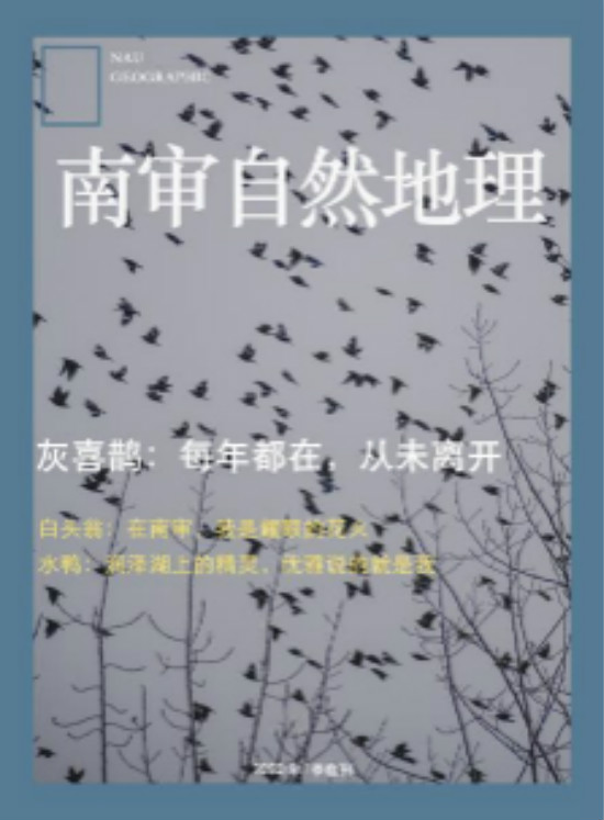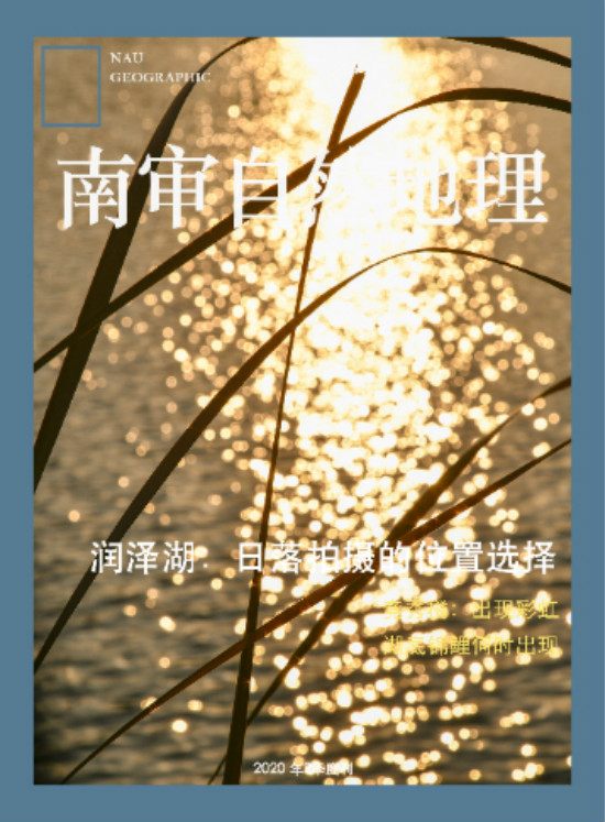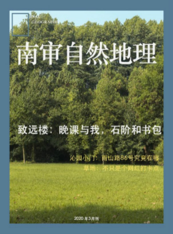 南审地理杂志的设计者,2018级孙昊晨同学说:“为了致敬自然地理杂志,同时显示出南审特色,我在设计里沿用了标志性的纯色外框和logo,但是把它的颜色换成了代表南审的普鲁士蓝。”