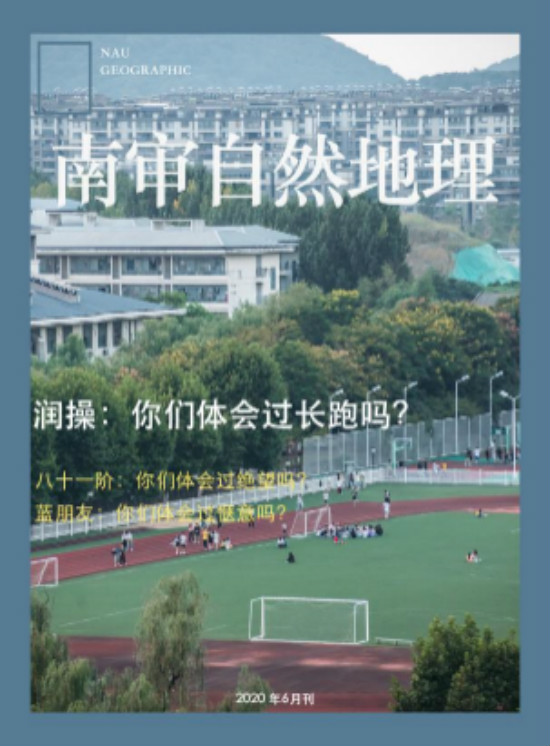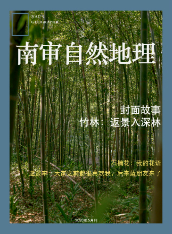 (五月刊)五月份的南审地理杂志,使用了校内竹林作为封面图片,以王维《鹿柴》中的“返景入深林”作为主标题,留给读者思考的空间。同时,副标题则显得更加幽默,石楠花的梗,源自于每年四五月,校园里盛开的石楠花都会散发出浓烈的气味,使得路过的同学们纷纷掩住口鼻。由于校园内只能步行,在南审开通校园小公交之前,保安大叔的巡逻车是同学们羡慕的对象,天气不好的时候,晚归的同学们偶尔还会被保安大叔你暖心地用巡逻车送回宿舍门口。