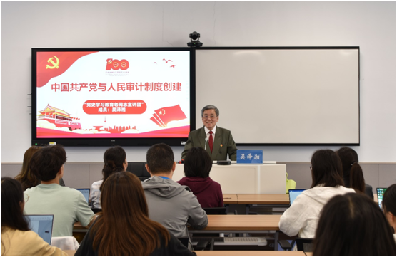 为进一步推动党史学习教育走向深入,充分发挥我校离退休老领导、老同志的理论优势、威望优势,讲好党史故事、传承红色基因, 5月20日,国际学院特邀校“党史学习教育老同志宣讲团”成员吴泽湘老师上专题党课,主题为“中国共产党与人民审计制度创建”。党课由国际学院党总支书记姜德波主持,全院教职工和学生入党积极分子参加。