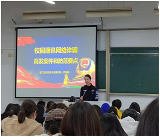 浦口公安分局反诈中心陈莹哲警官、钦林雨警官、司权警官和胡彩凤警官,通过大量真实、生动的案例,警示宣传视频等,详细介绍了当前大学生电信诈骗的严重形势,对当前在大学生群体中发生概率较高的刷单返利、冒充公检法人员、购物理赔、冒充身份、网络贷款、裸聊、虚假购物平台、游戏账号买卖、消费贷记录消除等10余种电信诈骗手段进行了逐一讲解。在如何预防诈骗上,警官们提醒同学们防范电信诈骗要从“坚持天上不会掉馅饼”、“培养逆向思维”、“不点陌生链接”、“安装反诈软件”等方面进行预防。
