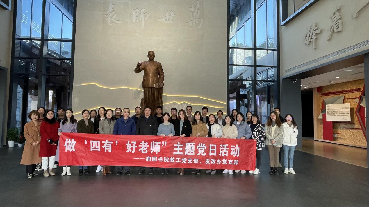 为深入学习贯彻习近平新时代中国特色社会主义思想,加强书院师德师风建设,在党的十九届六中全会胜利闭幕和人民教育家陶行知先生诞辰130周年之际,润园书院教工党支部和发改办党支部于11月12日下午,共同前往行知园开展“立师德、铸师魂,做‘四有’好老师”主题党日活动。