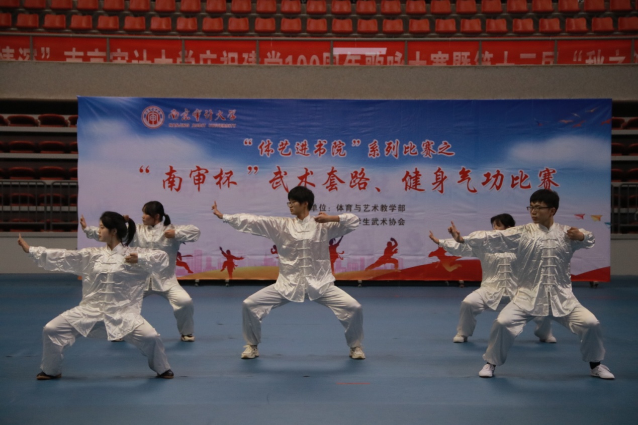 12月11日下午,305名同学齐聚体育健身中心,共同参加“体艺进书院”系列比赛之“南审杯”武术、健身气功、健身操比赛。比赛场上,各参赛队尽显风采,队员们精神饱满,意气风发,张弛有度,神形兼备,充分展示出传统体育文化的独特魅力。