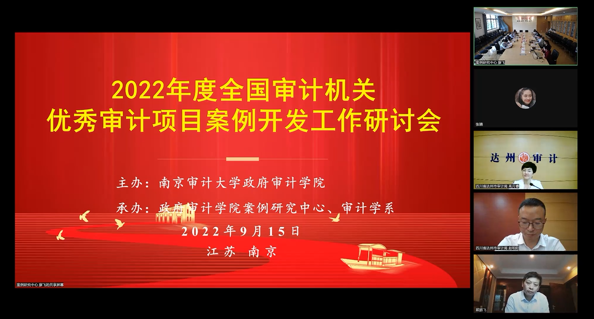 9月16日,由政府审计学院举办的2022年全国审计机关优秀审计项目案例开发工作研讨会通过线上线下相结合的方式召开。研讨会在敏行楼四楼会议室设主会场,政府审计学院部分师生代表参会,李兆东副院长主持研讨会。审计署法规司和上海市审计局、浙江省杭州市审计局、四川省达州市审计局、江西省宜春市审计局代表线上参会。