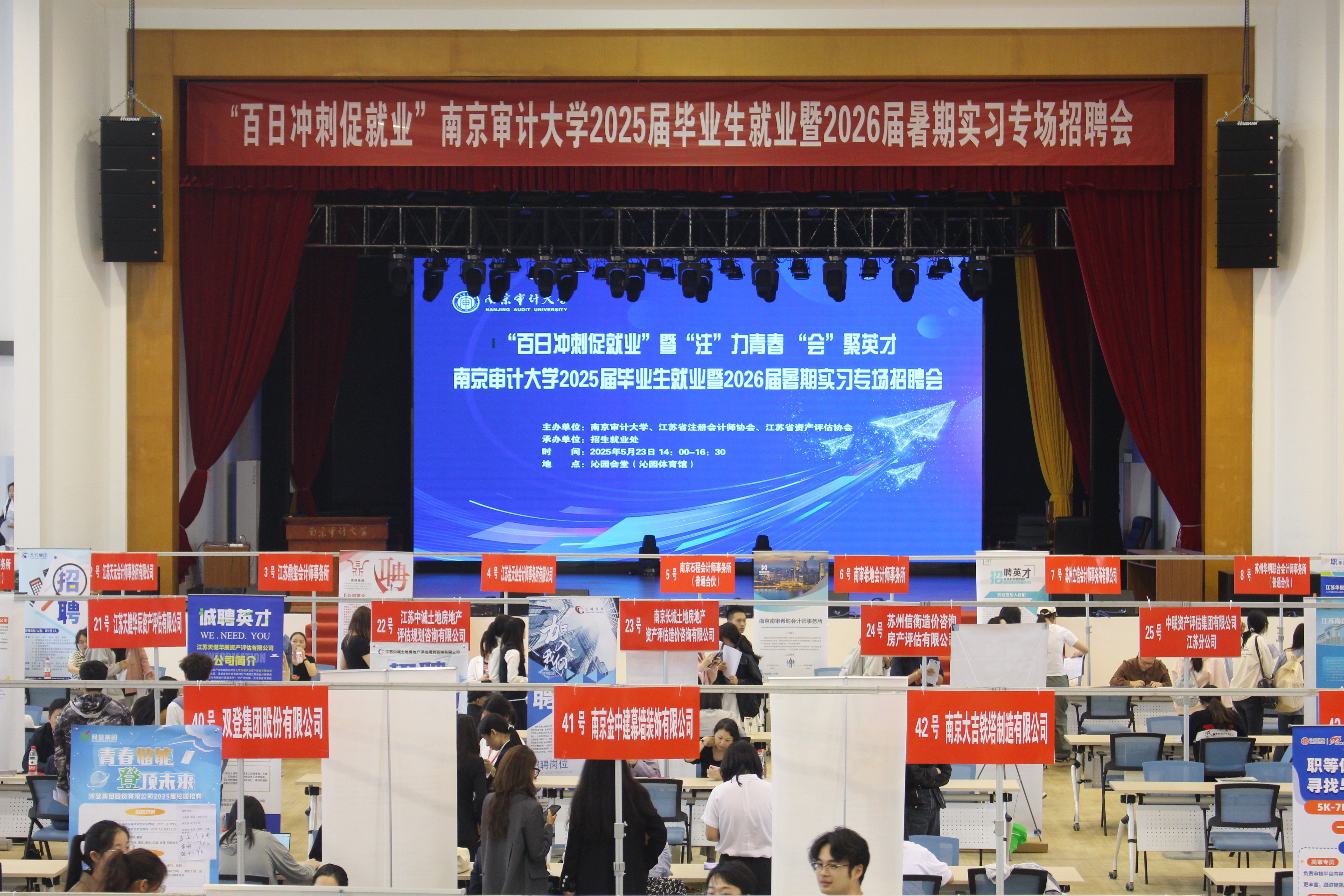 5月23日下午,“百日冲刺促就业”暨“注”力青春 “会”聚英才南京审计大学2025届毕业生就业暨2026届暑期实习专场招聘会在沁园会堂举办。江苏省财政厅二级巡视员、省注册会计师行业党委书记章江益,南京审计大学党委常委、副校长周方舒到场指导。