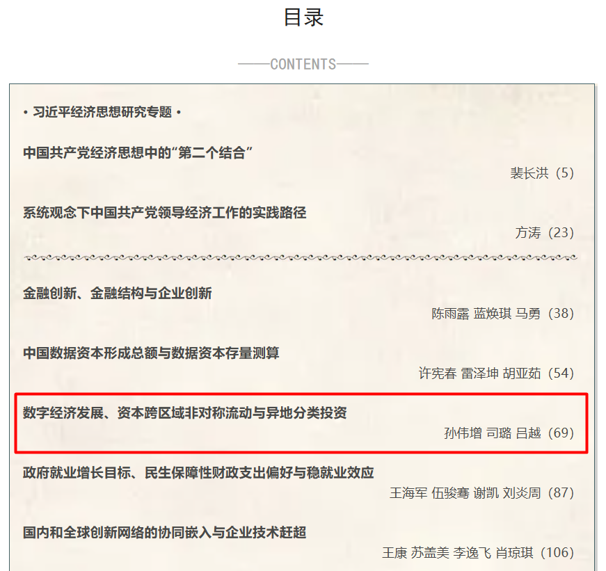 近日,我校联合研究院孙伟增教授与中央财经大学司璐博士、对外经济贸易大学吕越教授合作的论文《数字经济发展、资本跨区域非对称流动与异地分类投资》在《经济研究》2025年第3期公开发表。