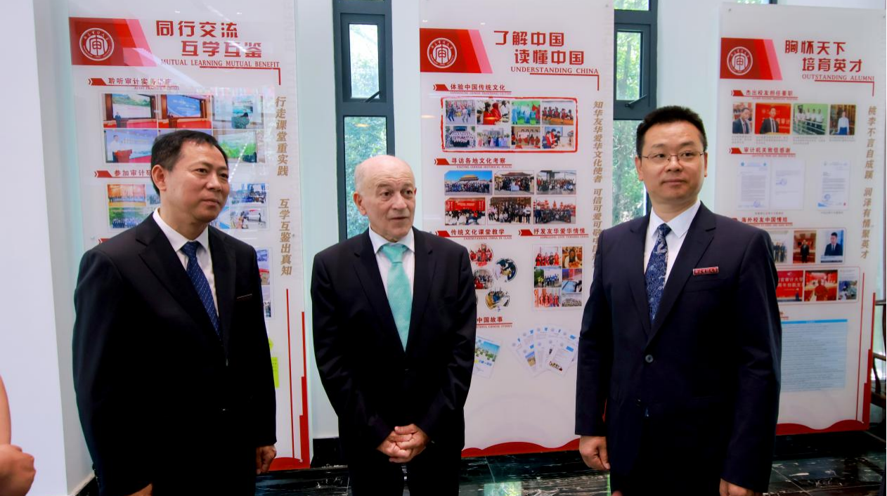 赛德拉斯先生一行首先参观了我校审计文化与教育博物馆,深入了解了中国审计的历史传承与现代审计教育的发展成就。当他走到荣誉教授墙时,看到自己2016年时担任巴西联邦法院院长期间受聘为南京审计大学荣誉教授的照片,非常感动,他回忆起当时的情景,发出感慨:“这次来中国,心里最记挂的就是南京审计大学!”