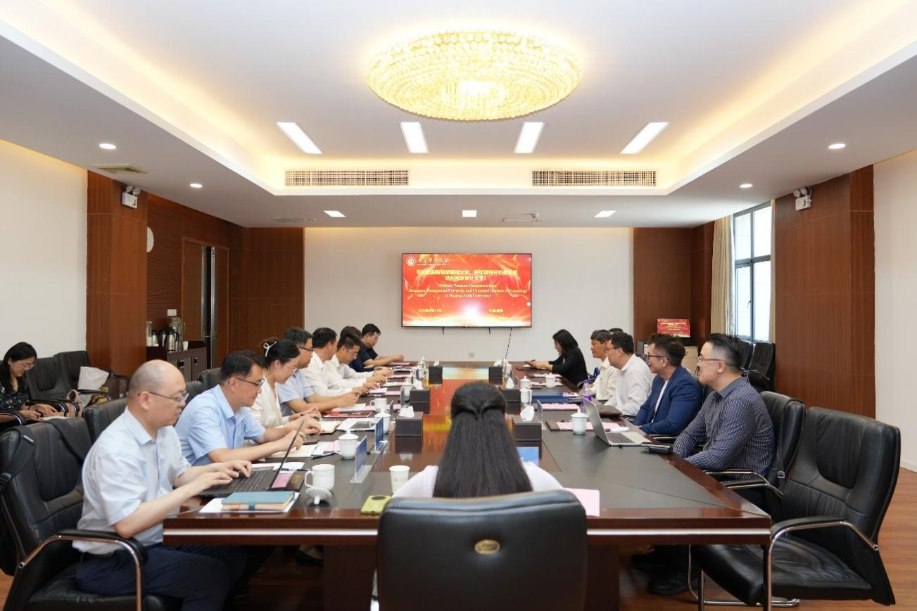 6月17日上午,新加坡管理大学(简称新大,SMU)专业进修学院院长林立杰、副院长刘光明与新加坡特许科技学院院长李德威一行共同访问我校。校党委书记董必荣、党委常委、副校长李乾文出席会见。学校国际合作与交流办公室、教务处、社会审计学院、商学院、国际学院、莫愁校区办公室等部门负责人参加会谈。会议由李乾文副校长主持。
