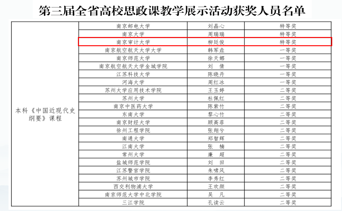 近日,江苏省教育厅公示《省教育厅办公室关于组织开展第三届全省高校思政课教学展示活动的通知》(苏教办社政函〔2024〕25号),马克思主义学院柳廷俊老师讲授的《提出实现中华民族伟大复兴的中国梦》荣获特等奖。这是我校在此项最高水平思政课教学竞赛中首次收获特等奖荣誉,并推荐参加全国高校思政课教学展示活动。