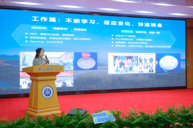 随后,2022届校友现任数字能源账务的王雨宁和青海/西藏终端财经主管的郭鑫平分享了从“南审人”到“华为人”的成长蜕变,她们以亲身经历讲述了在华为平台上所获得的国际化视野、专业能力的飞速提升以及“奋斗者”文化的深刻内涵,校友们的“现身说法”,为在场的学弟学妹们描绘了一幅清晰而充满吸引力的职业蓝图,引发了强烈共鸣。