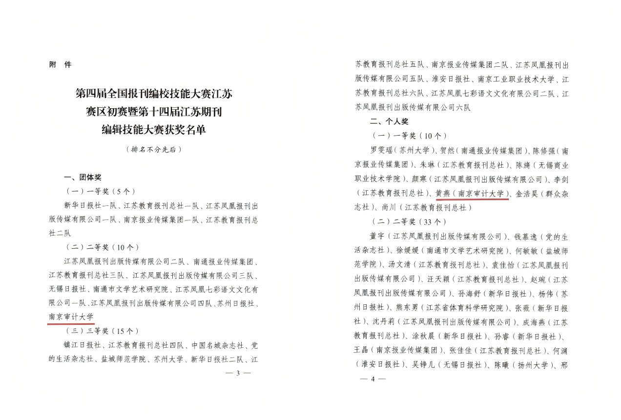 近日,第四届全国报刊编校技能大赛江苏赛区初赛公布获奖结果,我校期刊社黄燕获个人奖一等奖,由高婷、李思远、苗竹青组成的团队获团体奖二等奖。