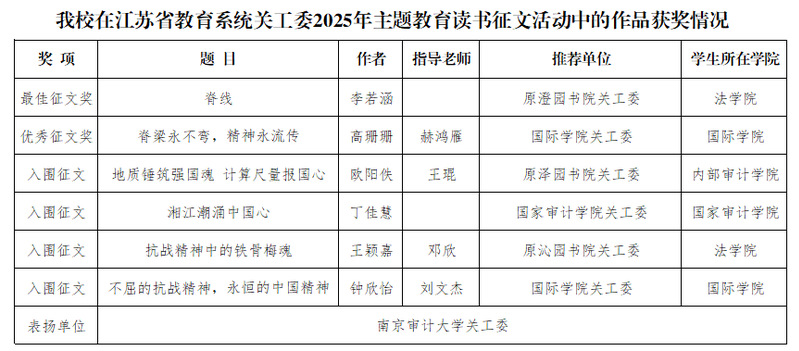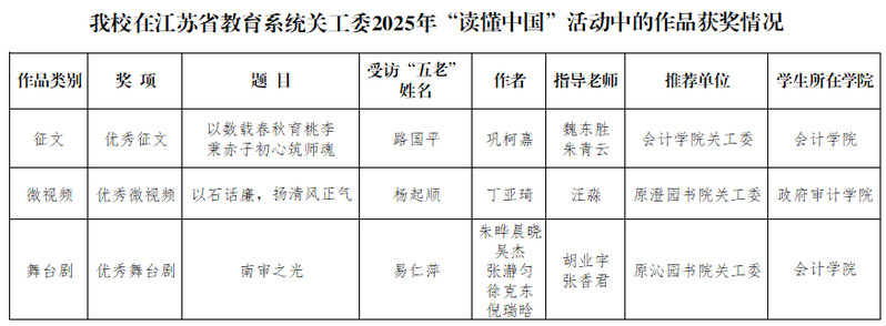 近日,江苏省教育系统关工委发布《关于公布2025年“读懂中国”活动入选作品名单的通知》(苏教关委〔2025〕13号)和《关于公布2025年主题教育读书征文活动入选征文名单的通知》(苏教关委〔2025〕12号)。在“读懂中国”活动中,我校报送的三项作品全部获评优秀。在主题教育读书征文活动中,我校共有6篇征文获奖,其中包括最佳征文1篇、优秀征文1篇、入围征文4篇。凭借在组织工作与征文质量方面的表现,我校关工委被评为“2025年主题教育读书征文活动表扬单位”。