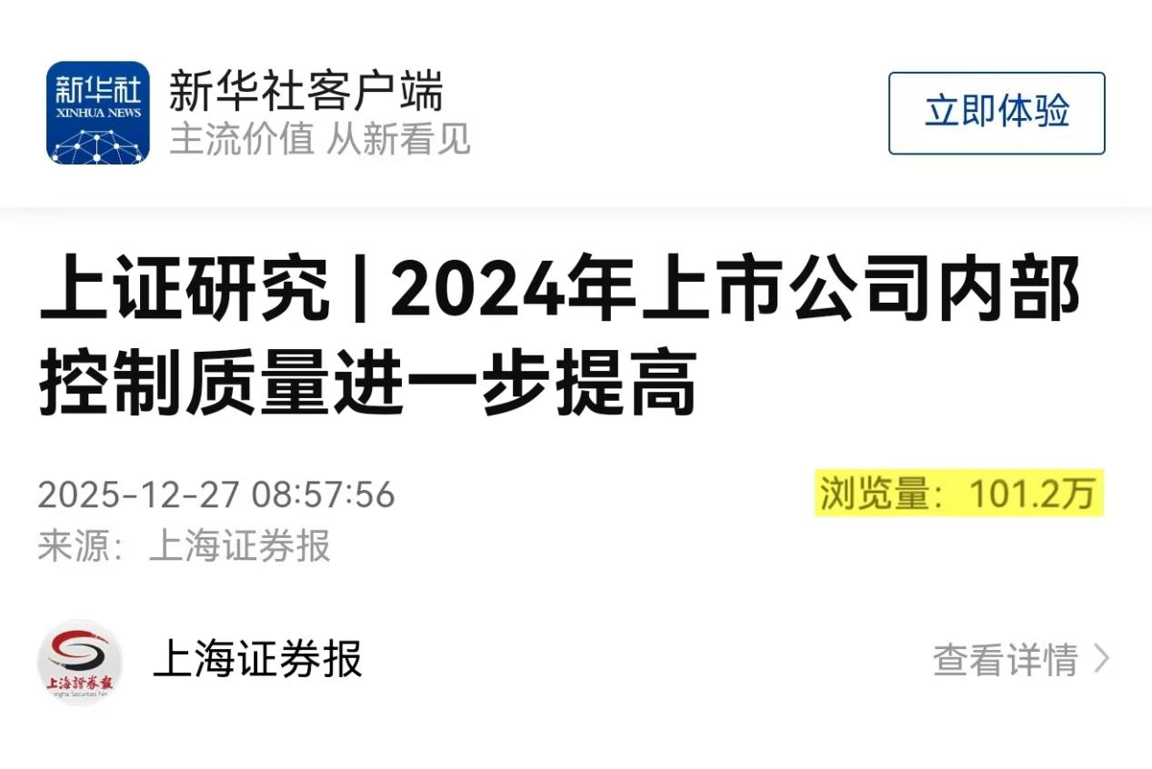 12月27日,新华社客户端转发了《上海证券报》发布的我校审计学部主任陈汉文教授团队的报告《2024年上市公司内部控制质量进一步提高》,当天浏览量超100万次。这是该团队连续十六年发布“中国上市公司内部控制评价报告”,也是其承担的教育部哲学社会科学研究重大课题攻关项目的重要研究成果之一。