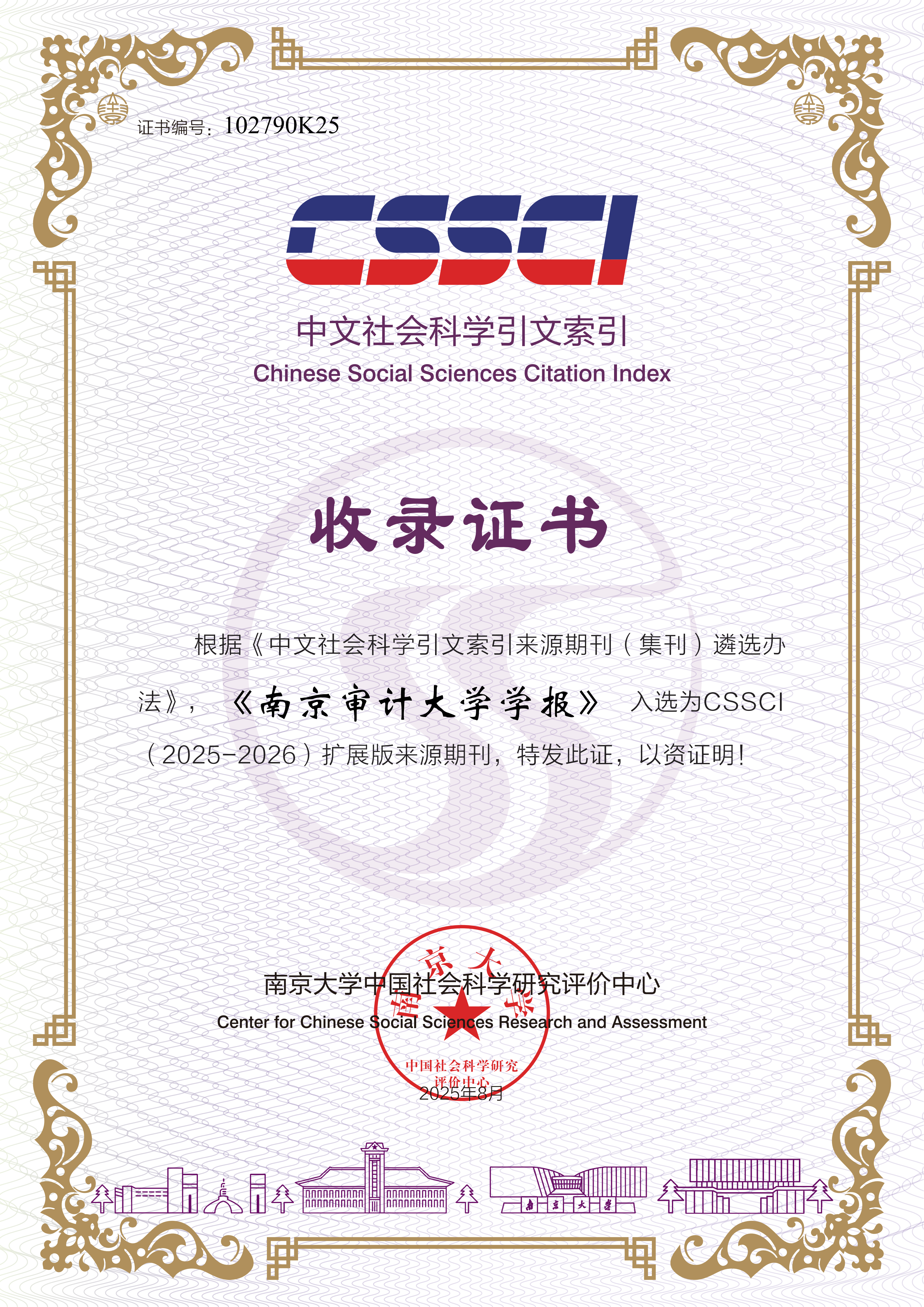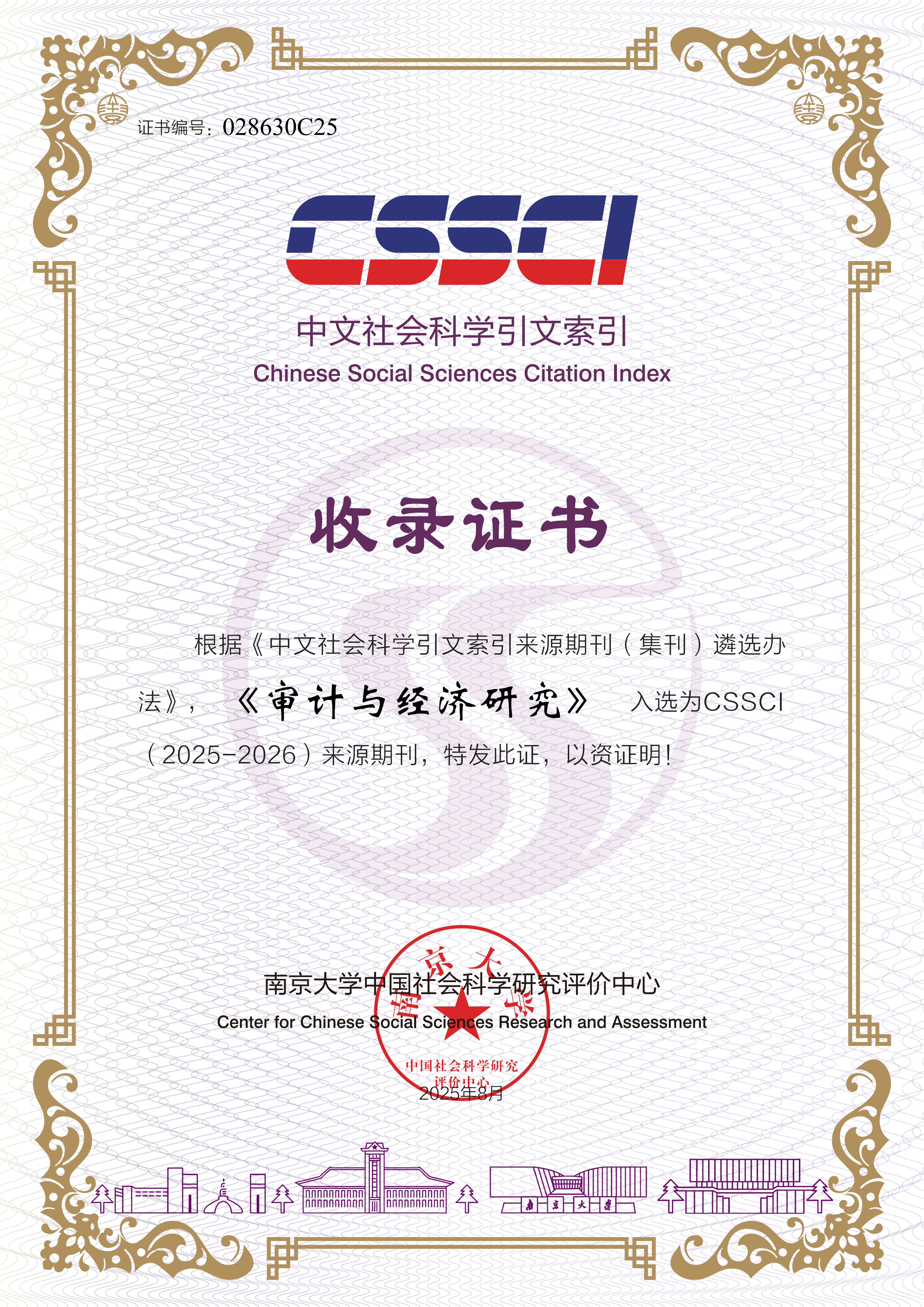 近日,学校收到来自南京大学中国社会科学研究评价中心的收录证书。根据《中文社会科学引文索引来源期刊(集刊)遴选办法》,我校主办的《审计与经济研究》继续入选为CSSCI(2025-2026)来源期刊,《南京审计大学学报》继续入选CSSCI(2025-2026)扩展版来源期刊。据悉,《审计与经济研究》自2010年首次入选CSSCI来源期刊以来,已连续8次入选;《南京审计大学学报》自2017年首次入选CSSCI扩展版来源期刊以来,已连续5次入选。