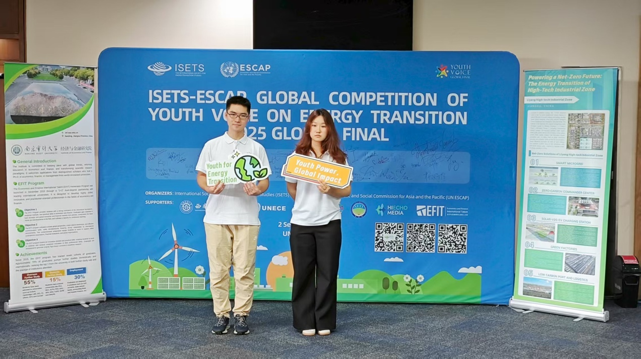 我校经济与金融研究院学生杨济豪、朱轩逸作为志愿者全程参与此次联合国会议组织工作,负责现场协调、评审支持、会务保障等关键环节。在赛事期间,杨济豪和朱轩逸两位同学还受邀参加了包括联合国亚太能源委员会(EGC)政府间会议、EWG-SDG7专家工作组会议及区域能源互联互通边会等系列活动。在交流与学习中,他们深刻理解到课堂所学经济金融知识在能源互联互通、清洁能源普及及绿色转型中的现实应用,也深切感受到多边外交中的平等精神与中国在推动亚太绿色发展中的重要角色。