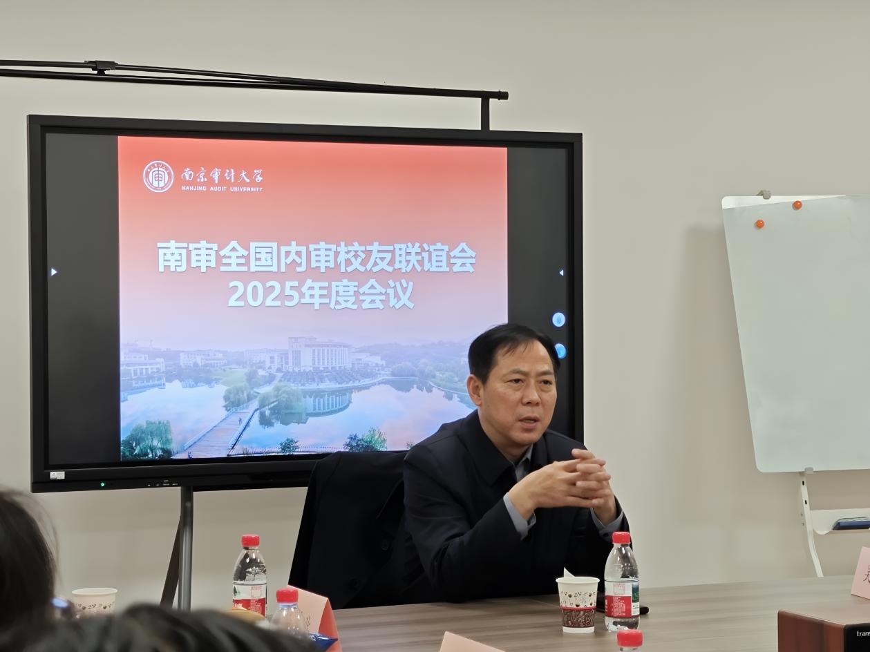 近日,南京审计大学全国内审校友联谊会2025年度会议在莫愁校区举行。校党委书记董必荣,校友联谊会特邀顾问、江苏省内审协会会长王会金,校友工作办公室主任张成出席,内审校友联谊会顾问、南京校友会会长、1984级校友张大庆,内审校友联谊会会长、1987级校友王庆,内审校友联谊会理事、工程审计校友会会长、1991级校友张海军等校友会代表及内部审计学院党政班子成员参加。会议由内审校友会秘书处副秘书长、2016级校友李广楠主持。