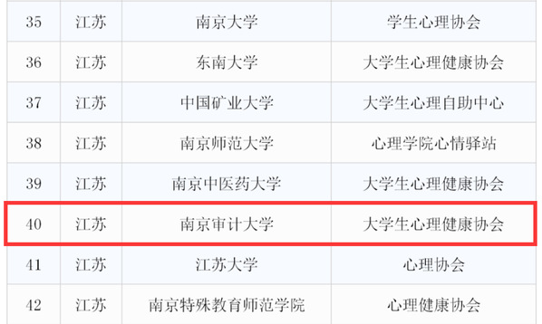 9月,共青团中央维护青少年权益部、中华全国学联秘书处、中国青年报社开展高校学生心理健康社团寻访活动,致力于遴选出一批心理社团直接联系、跟踪培养,合力守护大学生群体心理健康。最终,经过团中央权益部专家评审,南京审计大学大学生心理健康协会成功在540余个高校心理类社团组织中脱颖而出,入选共青团中央维护青少年权益部经确定的120个社团,由团中央直接联系、跟踪培养。