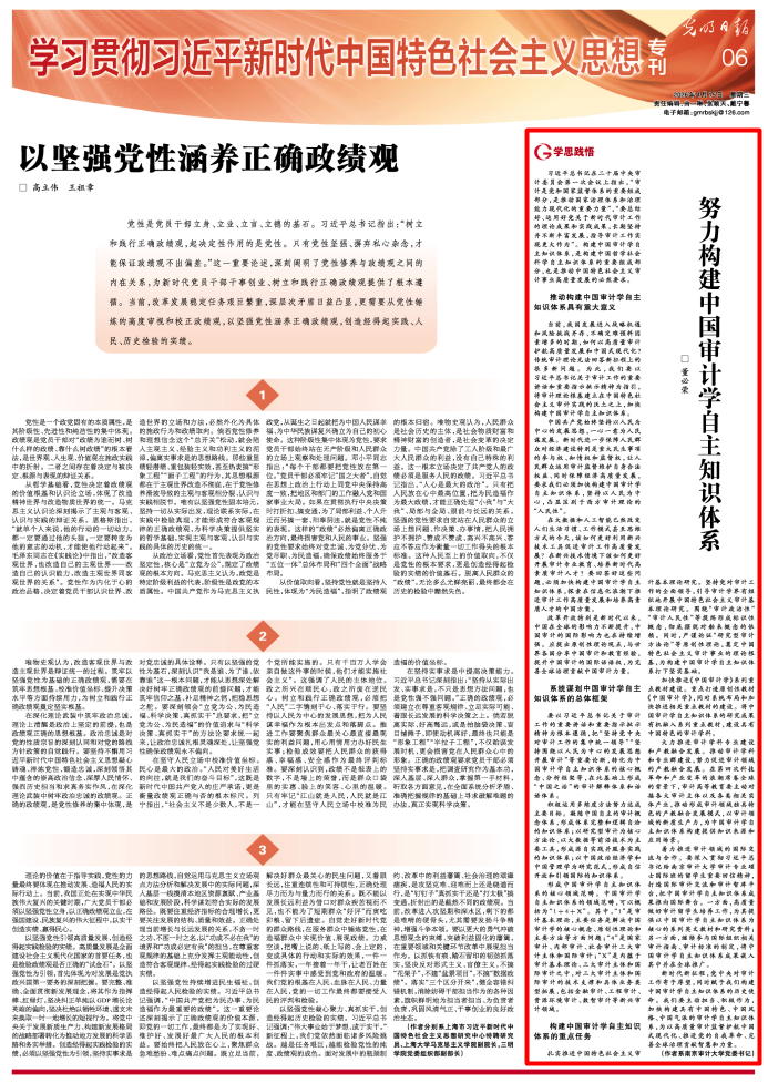当前,我国发展进入战略机遇和风险挑战并存、不确定难预料因素增多的时期,如何以高质量审计护航高质量发展和中国式现代化?传统审计理论无法回答新征程上的很多新问题。为此,我们要以习近平总书记关于审计工作的重要讲话和重要指示批示精神为指引,将审计理论根基建立在中国特色社会主义审计实践的沃土之上,加快构建中国审计学自主知识体系。