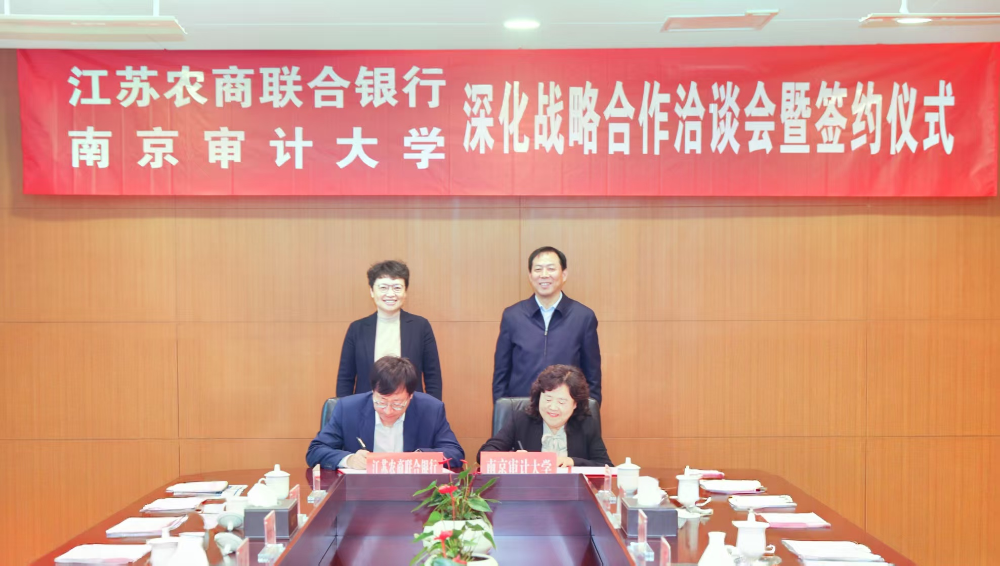 4月22日上午,南京审计大学与江苏农商联合银行深化战略合作洽谈会暨签约仪式在我校举行。江苏农商联合银行行长、党委副书记尹立鸿,副行长、党委委员李健,紫金农商银行行长、党委副书记阙正和;南京审计大学党委书记董必荣,党委常委、副校长卢亚娟出席会议,双方相关职能部门负责人参加会议。会议由卢亚娟主持。
