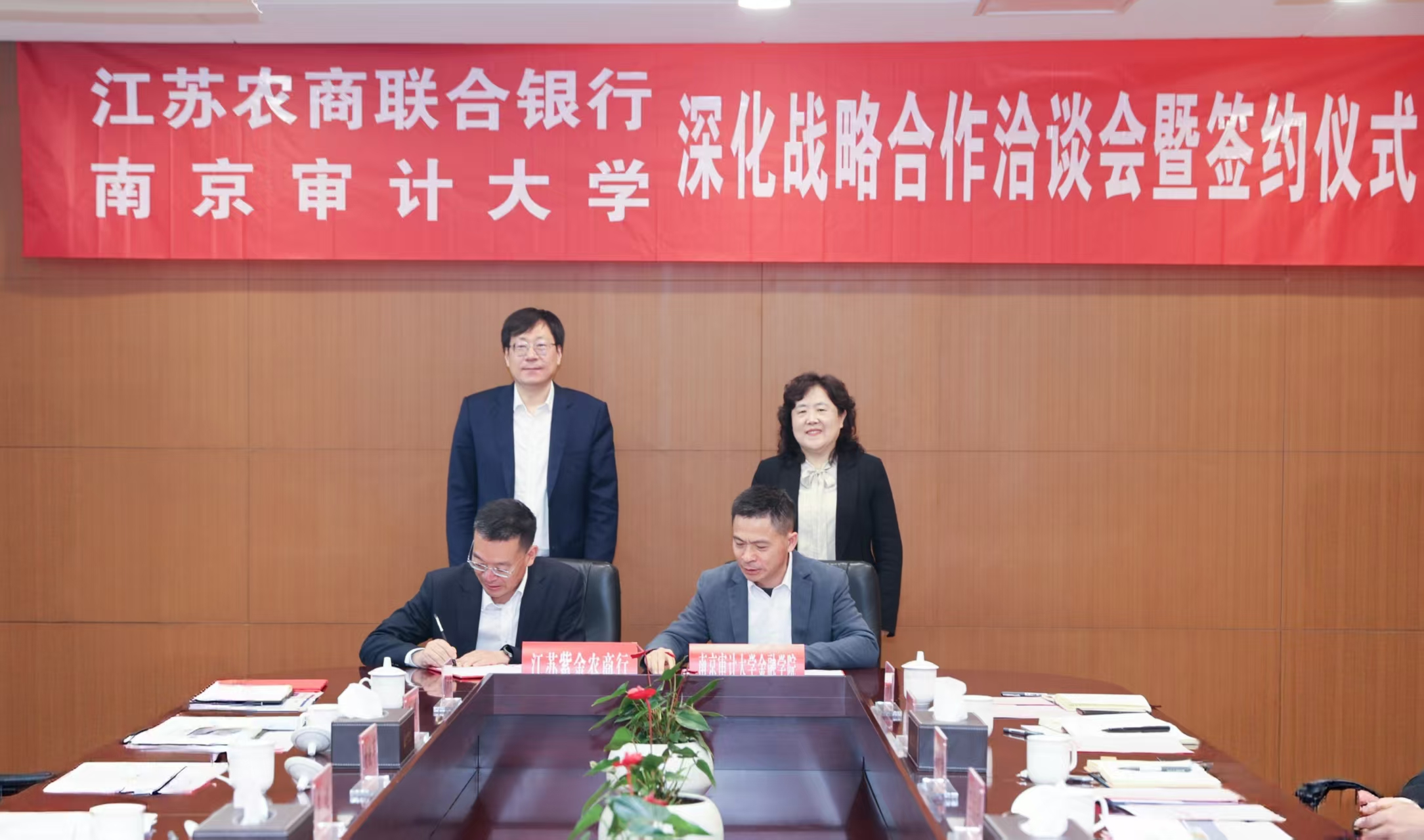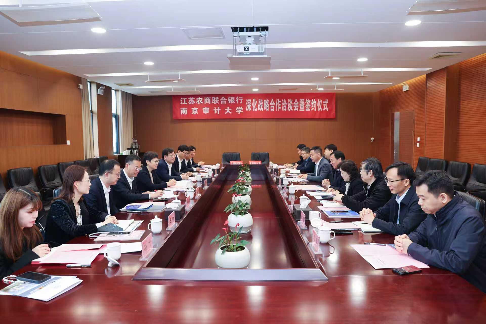 会上,双方就合作议题开展交流,并达成系列初步意向。江苏农商联合银行与南京审计大学、江苏紫金农商银行与南京审计大学金融学院分别举行了深化战略合作签约仪式。