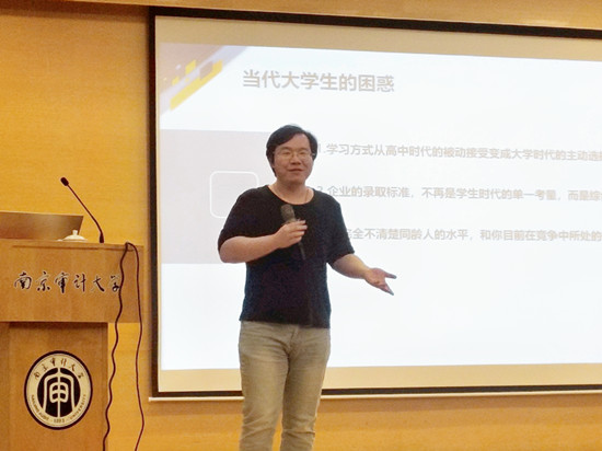 随后,吴政霖与同学们分享了在职业规划方面的观点。通过对我校毕业生就业去向特点的分析,吴政霖强调提前职业规划对于就业的重要意义。通过对一些成功案例的分享和展示,吴政霖建议同学们丰富个人经历,合理规划大学生活。