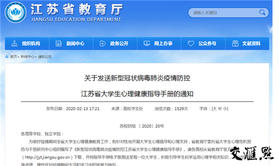 新冠病毒肺炎疫情当前,如何做好疫情期间全省大学生心理健康教育工作,有针对性地开展大学生心理疏导和心理支持?日前,江苏省教育厅委托省大学生心理危机预防与干预研究中心组织编写了《新型冠状病毒肺炎疫情防控江苏省大学生心理健康指导手册》(以下简称手册)。手册于2月13日发布,电子版将推送给全省每一位大学生,为186万大学生“抗疫、护心、复学”提供精准支持。