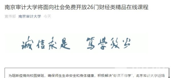 为阻断疫情向校园蔓延,确保师生生命安全和身体健康,积极解决“停课不停学”,南京审计大学近期将在“爱课程中国大学MOOC”平台推出26门财经类在线课程,以自身的优势为抗击疫情提供南审力量。