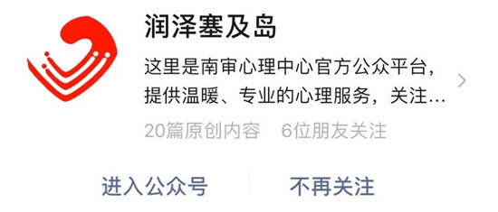 你听说过“润泽塞及岛”吗?它并不是一座真的岛,它是南京审计大学心理健康教育与指导中心官方微信公众平台,负责发布心理调节技术与相关资讯,同时提供温暖、专业的心理服务。