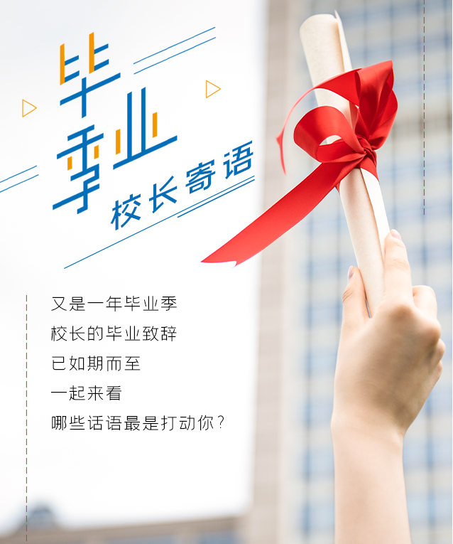 今天,2020届同学们,你们毕业了。你们将带着老山的泥土芬芳、润泽湖的清秀灵动、母校的精神气质,大学期间习得的知识技能,奔赴祖国乃至世界的四面八方,踏上你们新的征程。在此,我谨代表学校向2020届全体毕业生顺利完成学业、开启新的人生旅程表示热烈的祝贺,给你们送别,为你们壮行!向为同学们的成人成长成才付出辛勤汗水的老师们、家长们表示崇高敬意和诚挚感谢!