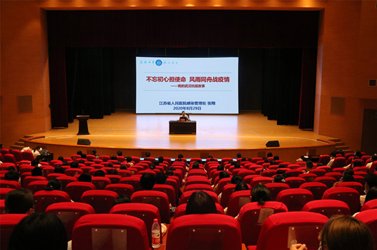 为深入开展爱国主义教育,深入宣传伟大抗疫精神,9月29日下午,我校泽园书院在审计干部教育学院学术报告厅举办“绽放战疫青春坚定制度自信”主题战“疫”思政课。泽园书院千余名2020级新生共同迎来了大学第一节特殊的思政课,来自江苏省人民医院的援鄂医疗队成员张翔、贡欢欢走上讲台,为他们讲述在武汉战“疫”的那些日子。