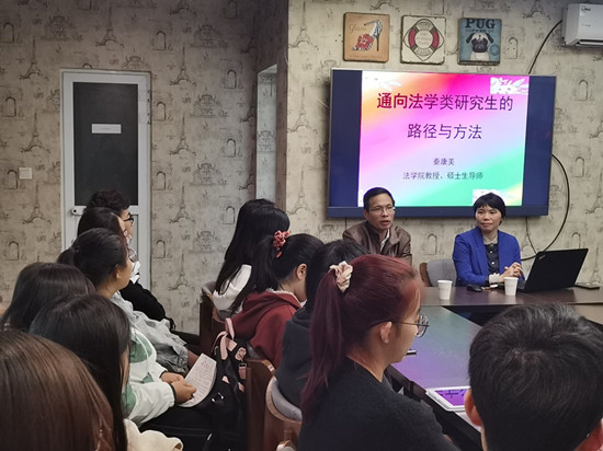 秦康美主要从认识自己、如何备考及考研辅导三方面对学生们进行指导。首先,秦康美尤其强调态度的重要性。秦康美展示了一个调查结果,这一调查结果显示,80%曾担任大学班干的学生在社会上能够获得成功。一个很重要的原因便是他们始终保持积极向上的态度,上传下达,主观能动性较强。因此,一个良好端正的态度是考研成功的必要条件。其次,秦康美提到了制定目标,并指出要根据自身实力制定目标,当目标确定后,要将目标落实在每一天,考研是一个慢慢的过程,不可能一蹴而就,同学们既要能合理分配时间,又能有足够的心理预期,不断对自己进行心理调适。再次,秦康美对如何进行考研备考提出指导意见。其中包括看书、做题、关注热点(指导案例)这三方面,也对学生们的英语水平提升提出建议和希望。最后,秦康美对考研辅导方面提出了自己的意见。对于线上辅导,秦康美鼓励同学们多多利用现有的互联网资源扩充自己的知识面,更好地提升自己。对于线下辅导,秦康美强调了良好的氛围对考研的重要性,鼓励同学们努力营造一个适合考研的良好氛围,协助考研成功。