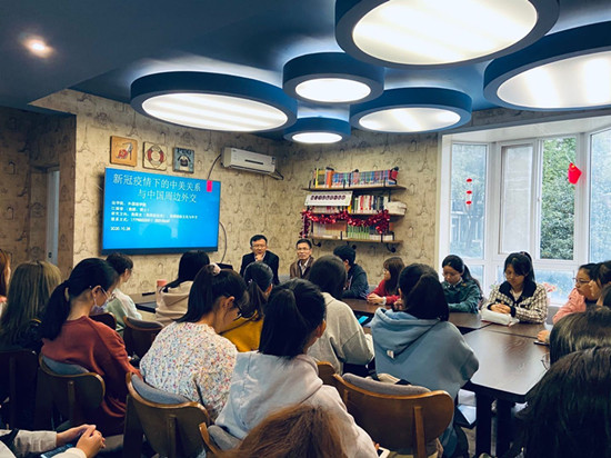 10月28日下午3点,沁园书院邀请到外国语学院党总支副书记江振春教授在沁缘书吧为同学们带来关于“新冠肺炎疫情下的中美外交关系与中国周边外交”主题讲座。本次讲座由沁园书院院长胡智强教授主持。