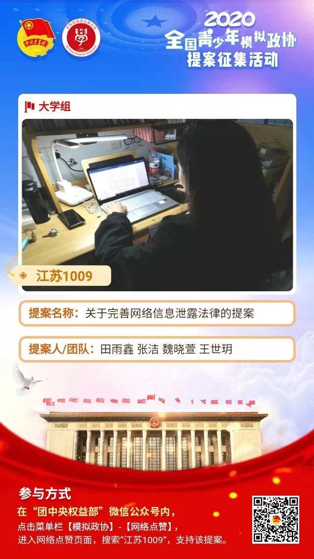 “面对网络信息泄露,法律的制定和实施已然体现出滞后性,所以完善针对网络信息泄露的法律显得极为紧迫和重要。”今天,记者从南京审计大学了解到,一份由该校田雨鑫、张洁、魏晓萱、王世玥团队提交的《关于完善网络信息泄露法律的提案》成功通过了地方初审以及团中央审核,入围2020年全国青少年模拟政协提案征集活动的专家评审环节。