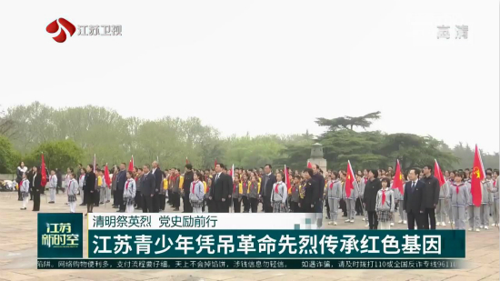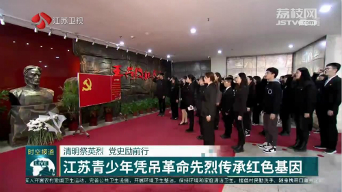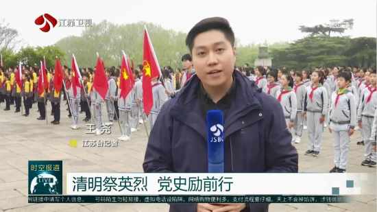 江苏台记者王尧说:“清明将至,江苏青少年代表在雨花台烈士陵园纪念碑广场前,缅怀革命先烈、寄托哀思。从党史中汲取丰厚营养,传承红色基因。”