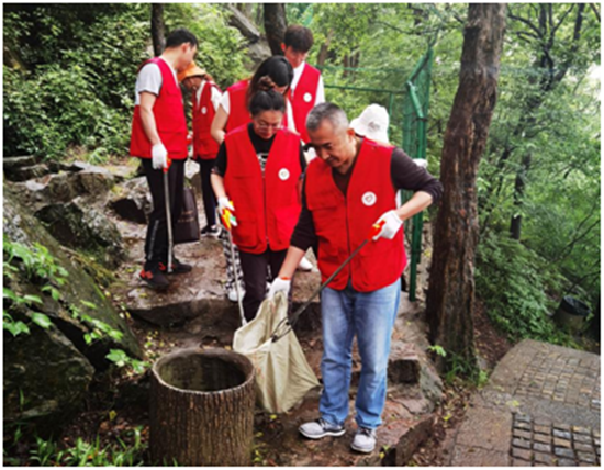 全体人员来到紫金山山顶公园向中山陵园管理局森林管理处马所长询问人员配备、日常工作等基本情况,并纷纷带上手套、拿起夹子与垃圾袋加入了“生态卫士”的队伍。范毅超向正在高温下辛勤工作的保洁员张师傅送去了冰水,并向他了解工作生活中的困难。