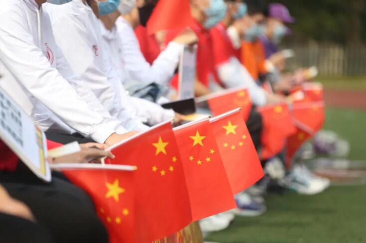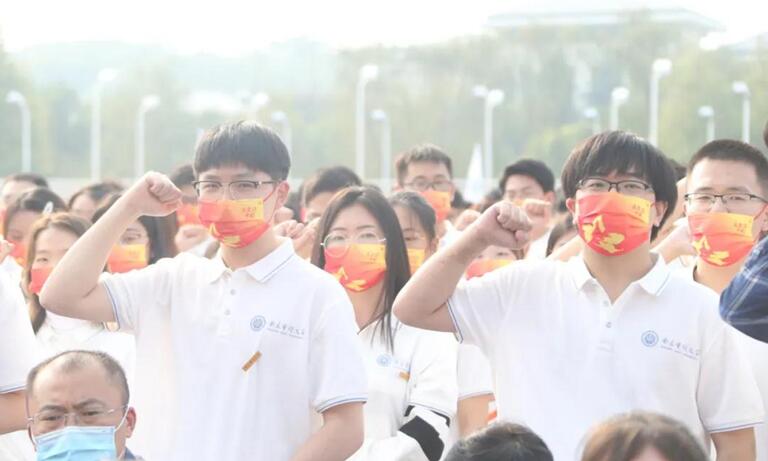 在新生代表的带领下,全体新生庄严宣誓:“用青春的风采扮靓今天的母校,用优秀的成绩贡献祖国的明天!”