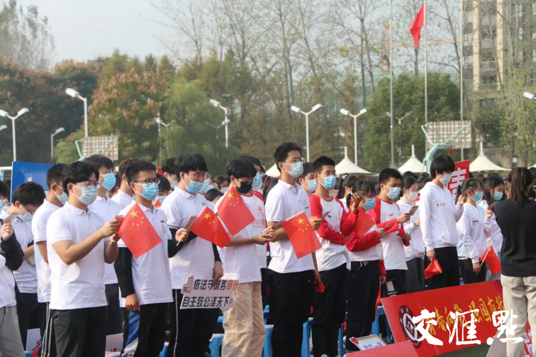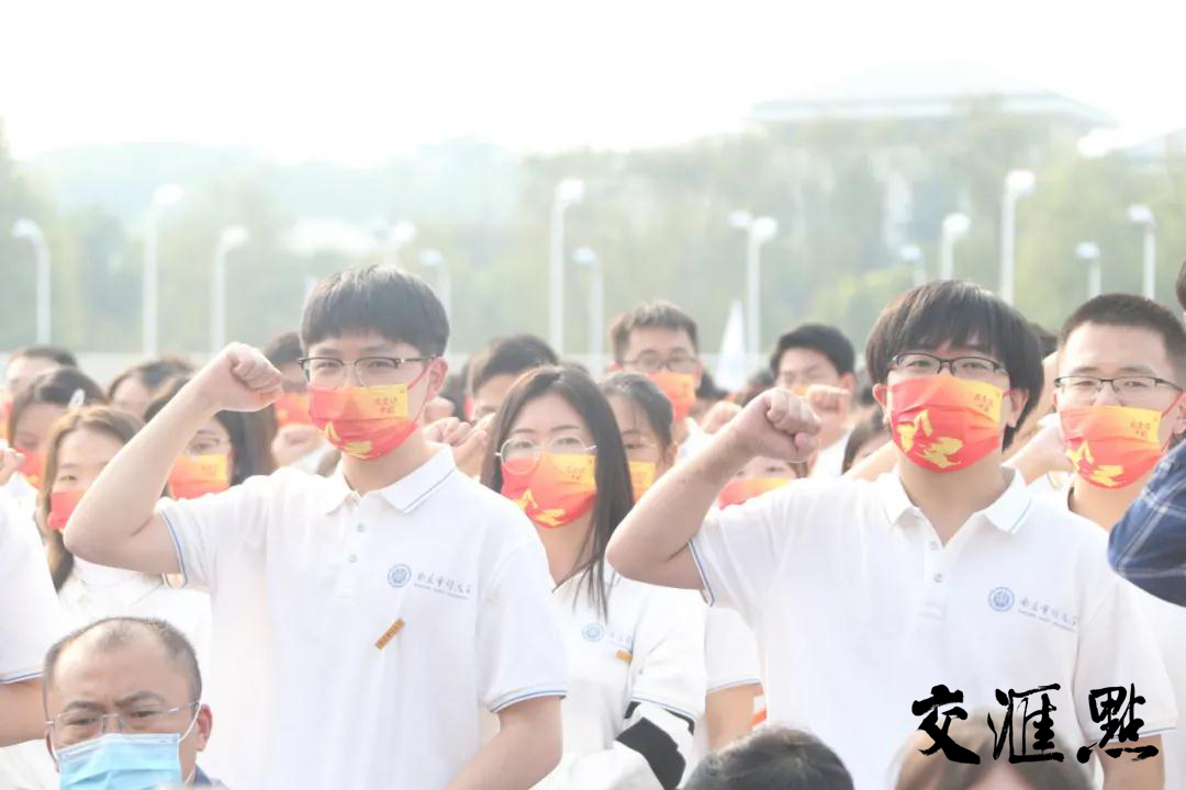 在新生代表的带领下,全体新生庄严宣誓:“用青春的风采扮靓今天的母校,用优秀的成绩贡献祖国的明天!”