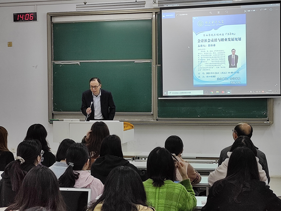 彭征安认为,社会责任与职业发展规划应当相辅相成,同学们要做一个有温度的会计领军人才。彭征安以自身带头救援汶川地震、援建希望小学、救助地震孤儿、抗战新冠肺炎疫情等事迹为引,提醒同学们重视社会责任,要将社会责任与职业规划相结合。