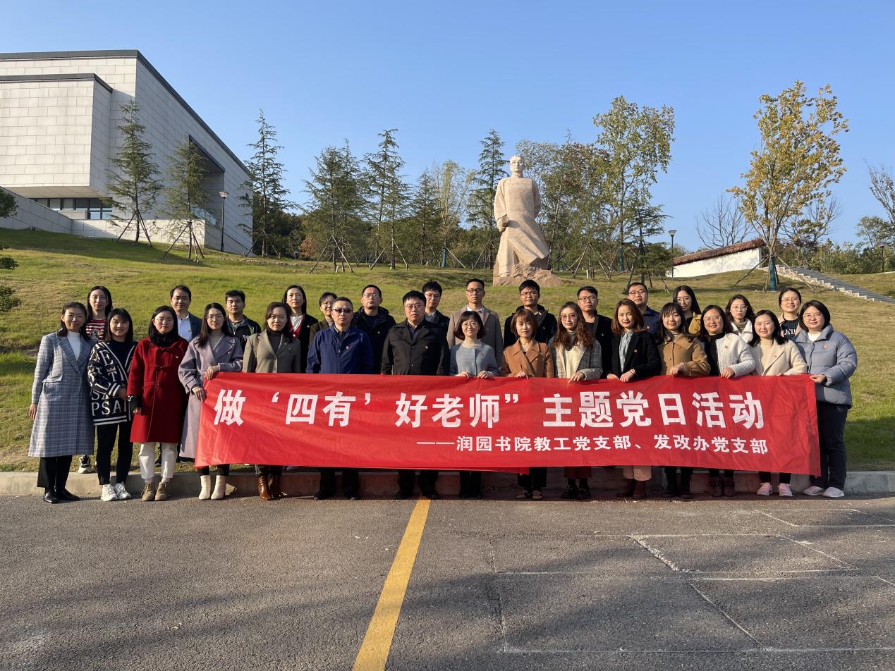 为深入学习贯彻习近平新时代中国特色社会主义思想,加强书院师德师风建设,在党的十九届六中全会胜利闭幕和人民教育家陶行知先生诞辰130周年之际,润园书院教工党支部和发改办党支部于11月12日下午,共同前往行知园开展“立师德、铸师魂,做‘四有’好老师”主题党日活动。