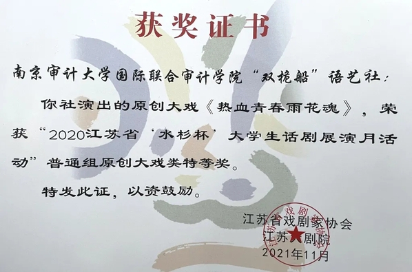 11月20日,由江苏省戏剧家协会、南京市文化馆主办的2020年度江苏省“水杉杯”大学生话剧展演月活动在南京文化艺术中心艺时间剧场圆满落幕。南京审计大学国际联合审计学院艺术党课《热血青春雨花魂》荣获普通组原创大戏特等奖,盖幢幢老师获“优秀指导老师”奖。
