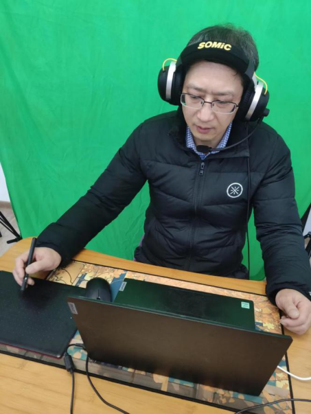 “教育教学其实是思想和心灵的沟通与交流”,为尽可能做到与线下面对面交流以及黑板板书一样的效果,何老师购买了数位写字板、专用耳机、直播背景幕布等设备,做到全程“露脸”和“板书”视频直播。当然,何“主播”也有“翻车”的时候,有一次课间休息时他把耳麦关了,忘记再次打开,再上课就对着屏幕讲了个“寂寞”;又比如,他主动与学生连麦,但被拒了,他自己也说:“哈哈,比较尴尬的!”