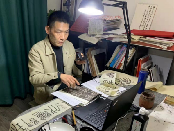 线上课改变了艺术课课堂讲授的自然秩序属性,尤其是书法课上随机表达的粉笔板书内容,在线上不能充分发挥。针对问题所在,蒋老师联系课程组其他老师,制定出线上课开展的具体方案。一是购置必备的网络教学设备,特别是高清直播摄像头,以增强书写画质,提高教学体验;二是更多地从美和审美出发,实现自然美、艺术美和生活美的相互关联,用美陶冶、以美抗疫;三是开展线上书法实践课,采取以毛笔带动硬笔的教学方式进行。
