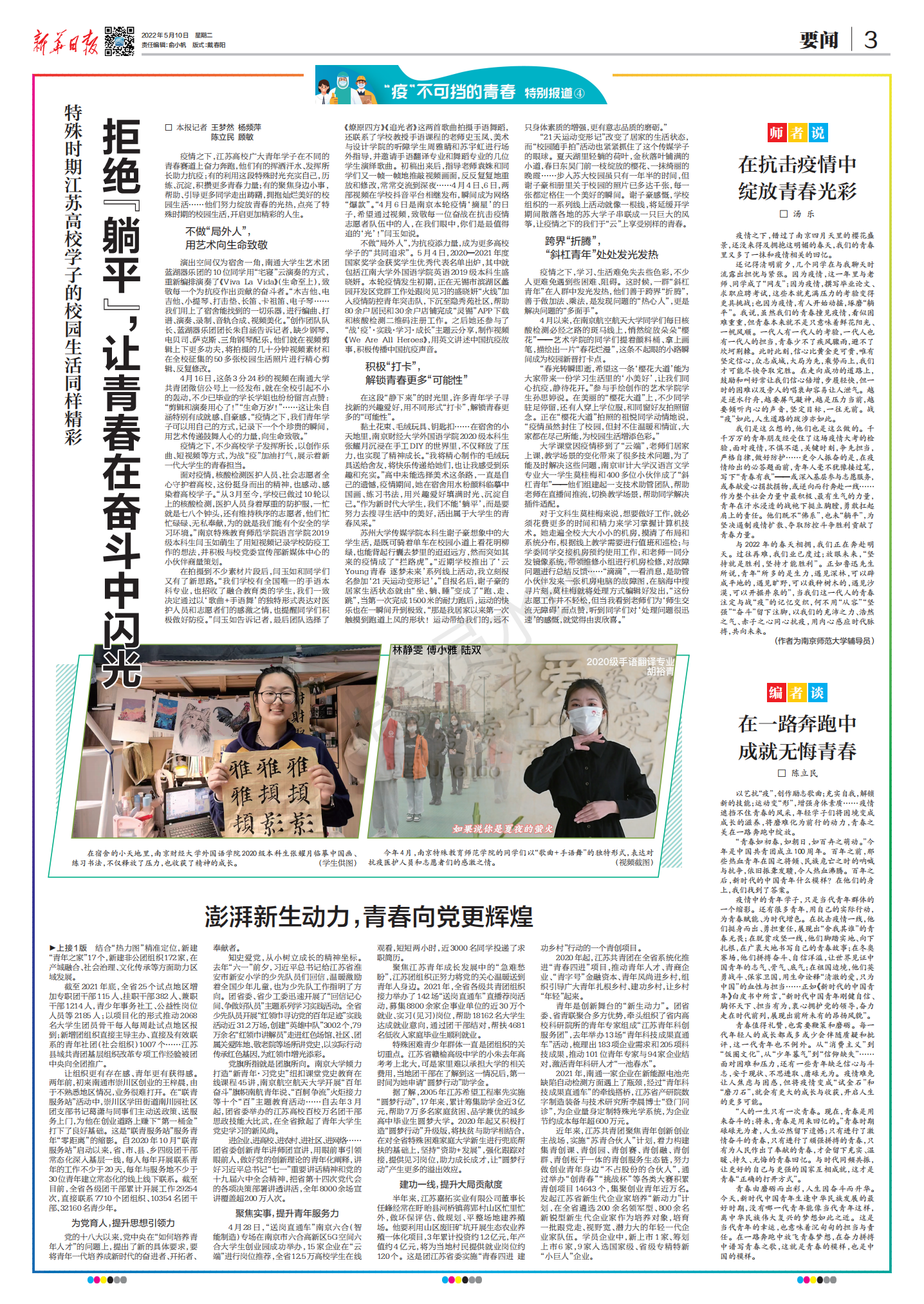 疫情之下,江苏高校广大青年学子在不同的青春赛道上奋力奔跑,他们有的挥洒汗水、发挥所长助力抗疫;有的利用这段特殊时光充实自己,历练、沉淀,积攒更多青春力量;有的聚焦身边小事,帮助、引导更多同学走出踌躇,拥抱灿烂美好的校园生活……他们努力绽放青春的光热,点亮了特殊时期的校园生活,开启更加精彩的人生。