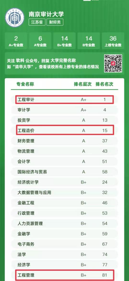 6月18日,高等教育专业评价机构上海软科正式发布2022中国大学专业排名。我校共有36个专业上榜,工程审计学院的3个专业——工程审计、工程造价、工程管理全部上榜。其中,新增专业工程审计获得A+等级评价,工程造价排名上升到第15位(2021年排名第24位),工程管理排名上升到第81位(2021年排名第116位)。