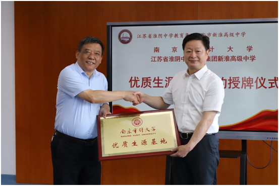 6月26日上午,我校招生宣传淮安组在校党委副书记张建红带领下,赴淮安市淮阴中学教育集团新淮高级中学参加南京审计大学优质生源基地授牌仪式。新淮高级中学校长蒋鼎宏、副校长戴睿、教务处主任徐祥进、校办主任陈雅琼出席仪式。参加仪式的还有澄园书院党委书记张武宁,工程审计学院党总支书记李祥,党总支副书记、副院长徐庆阳,党政办公室副主任李志亮等。