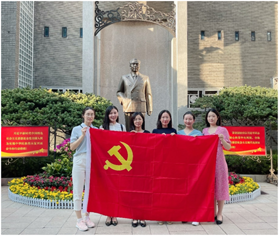 党支部全体党员在梅园新村纪念馆广场周恩来铜像前敬献花篮。随后在杨艳同志带领下,全体党员面向中共代表团群像的汉白玉浮雕一起重温入党誓词。在铿锵有力的宣誓中,全体党员重新感受入党时的荣誉感和使命感,更加坚定了跟党走的信心和决心。