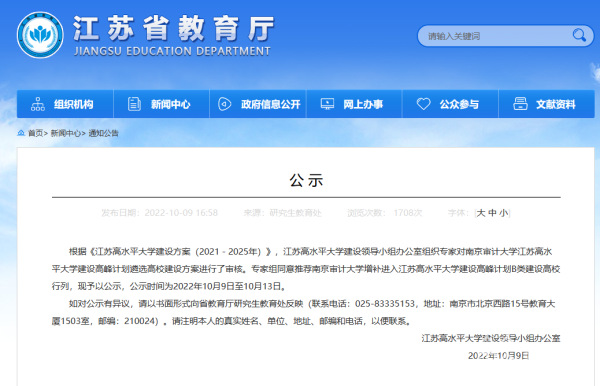 今天(10月10日),记者从江苏省教育厅了解到,根据《江苏高水平大学建设方案(2021-2025年)》,江苏高水平大学建设领导小组办公室组织专家对南京审计大学江苏高水平大学建设高峰计划遴选高校建设方案进行了审核。专家组同意推荐南京审计大学增补进入江苏高水平大学建设高峰计划B类建设高校行列,公示时间为2022年10月9日至10月13日。