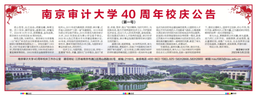 老山苍苍,长江汤汤;虎踞龙蟠,珠辉玉琅。四十风华,踔厉奋发;盛德日新,审耀天下。2023年10月18日,硕果飘香,金风送爽,南京审计大学将迎来40周年华诞。