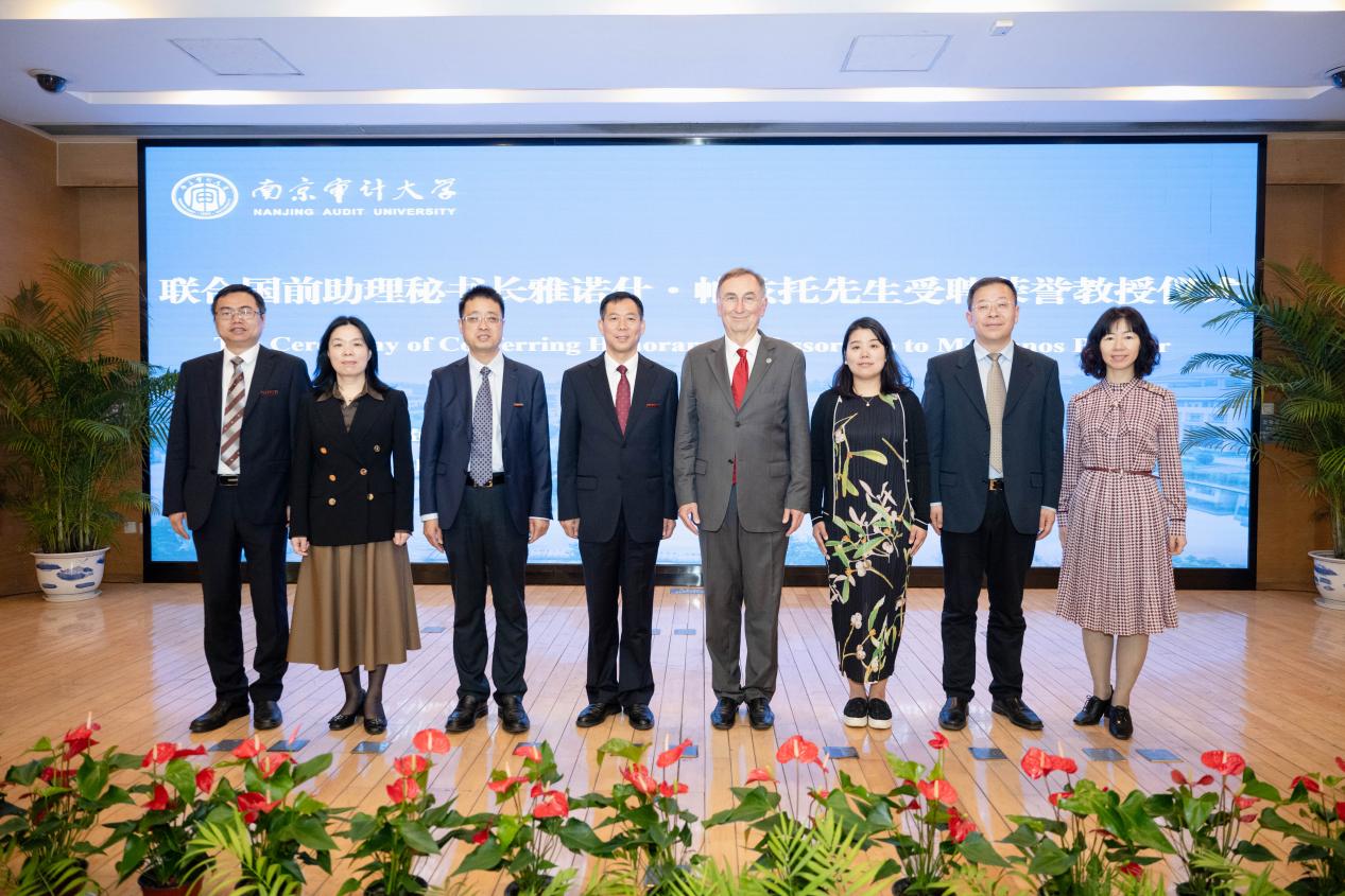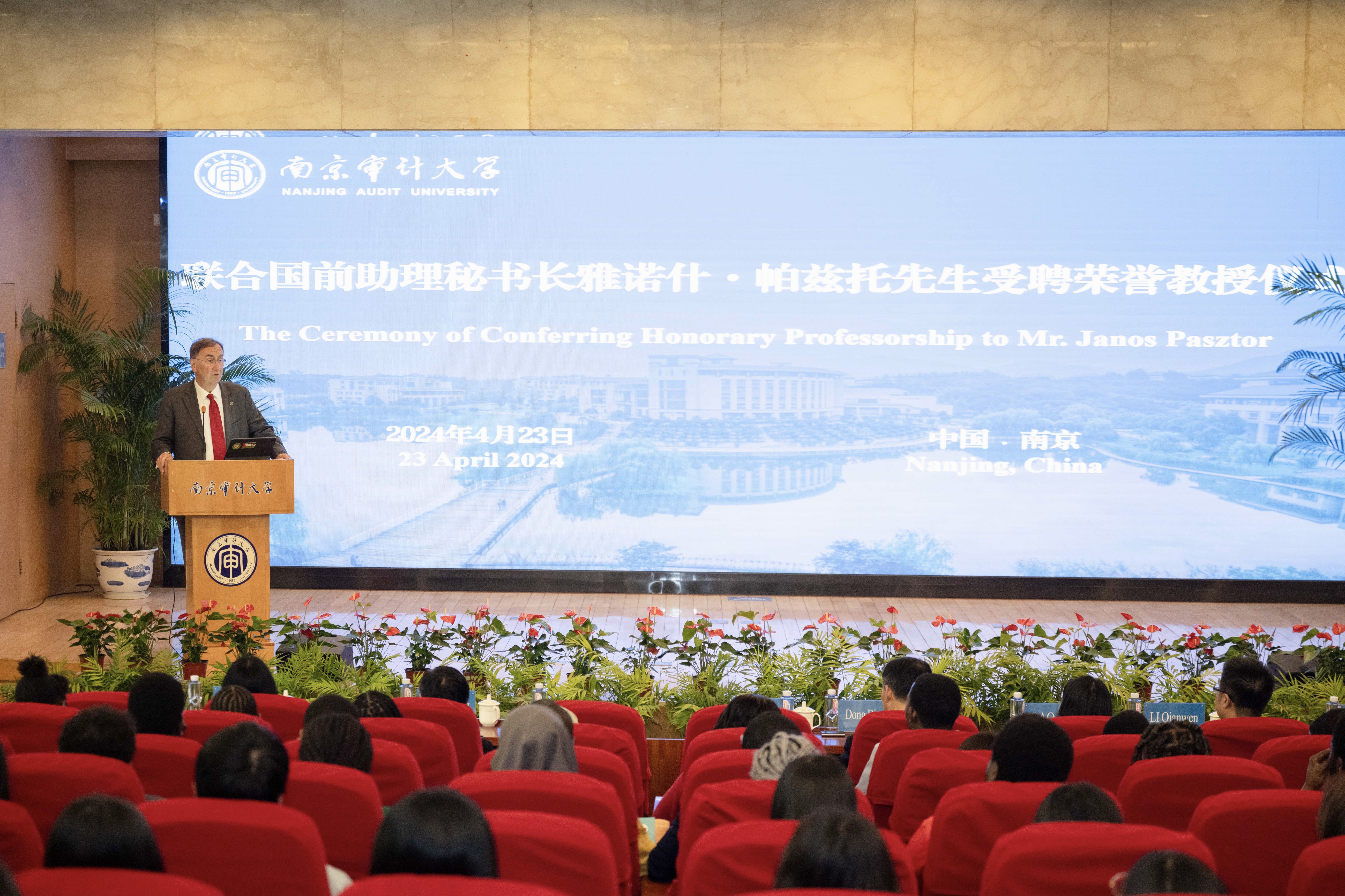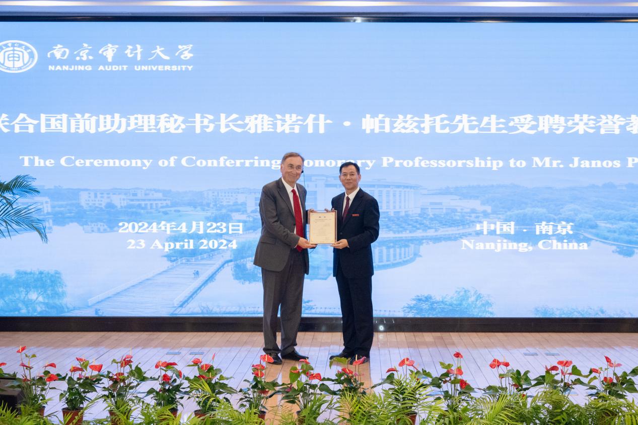4月23日,联合国前助理秘书长雅诺什·帕兹托受聘南京审计大学荣誉教授仪式暨演讲会在敏达学术报告厅举行。联合国前助理秘书长雅诺什·帕兹托,欧盟亚洲中心教务委员会主任高玲,南京审计大学校长董必荣出席受聘仪式,相关部门负责人及师生代表参加。副校长李乾文主持聘任仪式。