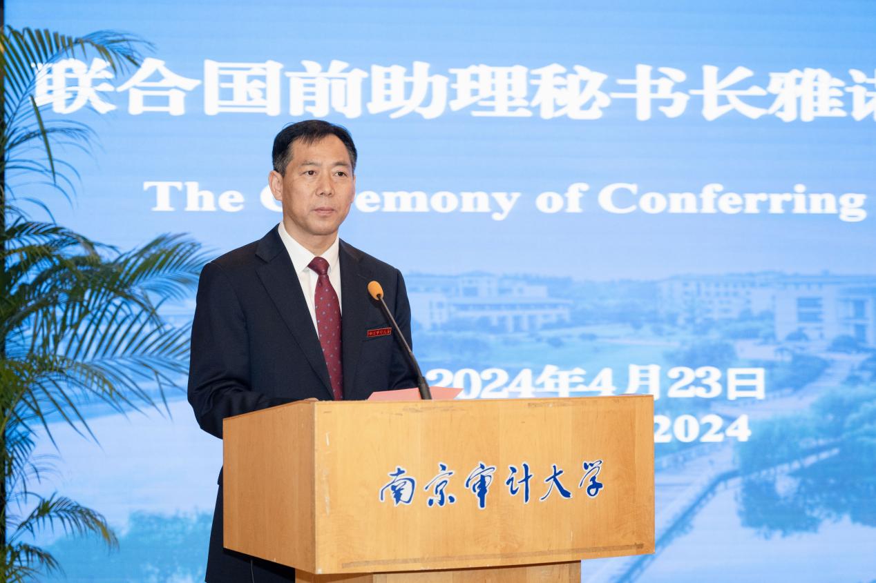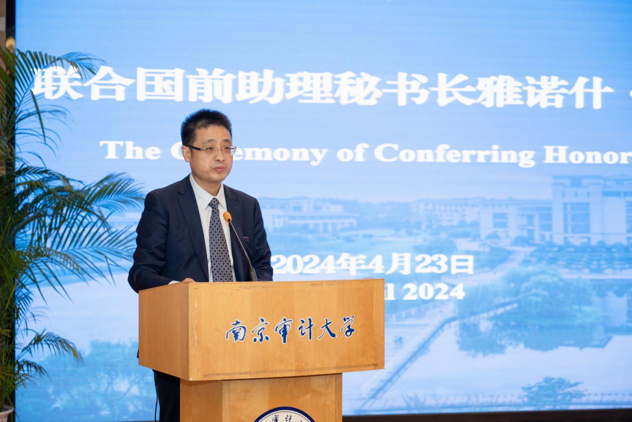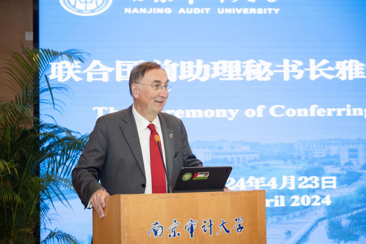 4月23日,联合国前助理秘书长雅诺什·帕兹托受聘南京审计大学荣誉教授仪式暨演讲会在敏达学术报告厅举行。联合国前助理秘书长雅诺什·帕兹托,欧盟亚洲中心教务委员会主任高玲,南京审计大学校长董必荣出席受聘仪式,相关部门负责人及师生代表参加。副校长李乾文主持聘任仪式。